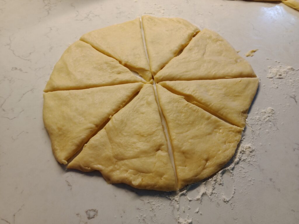 - Punch down dough, and divide it into 2 sections. Roll each half into a circle about 10″ In diameter and cut into 8 wedges.